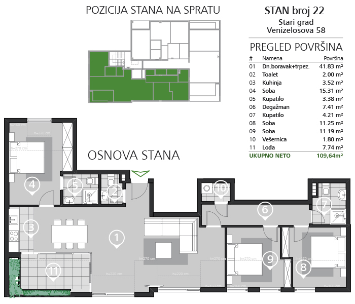 Ovaj penthouse je zaista nešto posebno. Budućim vlasnicima pruža fantastičan komfor, udobnost i spektakularan pogled na Dunav. Sastoji se od velike dnevne sobe sa kuhinjom i trpezarijom, tri spavaće sobe, dva kupatila, toaleta, vešernice i lođe. Odvojen spavaći blok sa degažmanom, dve spavaće sobe, kupatilom i vešernicom. Treća spavaća soba je master sa sopstvenim kupatilom. Stan je dvostrano orjentisan. Dnevna soba sa velikom terasom i spavaće sobe su orjentisani ka ulici sa spektakularnim pogledom na Dunav. Terasa je prava oaza za uživanje sa zelenom baštom. Stan je izuzetno sunčan i osvetljen. Na lođu se izlazi iz master spavaće sobe. Dve spavaće sobe su komforne sa mestom za veliki bračni krevet sa noćnim stočićima i ugradne plakare. Stan ima kosine u dnevnoj i spavaćim sobama koje kreću od visine 160cm. Sve ostale prostorije u stanu imaju visinu od 270cm. Sva kupatila su sa tuš kabinom.